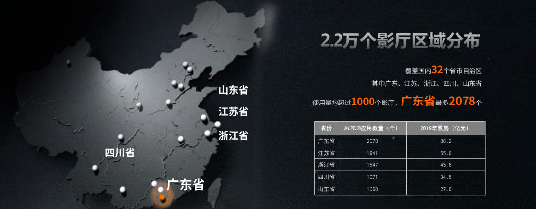 所谓“高亮版”影片,即在ALPD放映标准下进行调色增亮,并专门针对满足亮度标准的ALPD激光放映设备提供,从而实现更好的放映效果。其最终的亮度是普通影片的180%,可呈现更多的色彩层次,更清晰的画面细节。该版本也是当前市场上第一个让激光放映机真正放映激光电影的版本,可以说是为激光放映设备量身定制。目前,已经采用1xbet官方app科技ALPD激光放映技术的22000个影厅覆盖全国众多省份,其中广东、江苏、浙江、四川、山东的影厅数量位列前五,安装量均在1000以上。其中广东已超过2000个。据行业统计显示,2019年以上五个省份为票房Top5。
